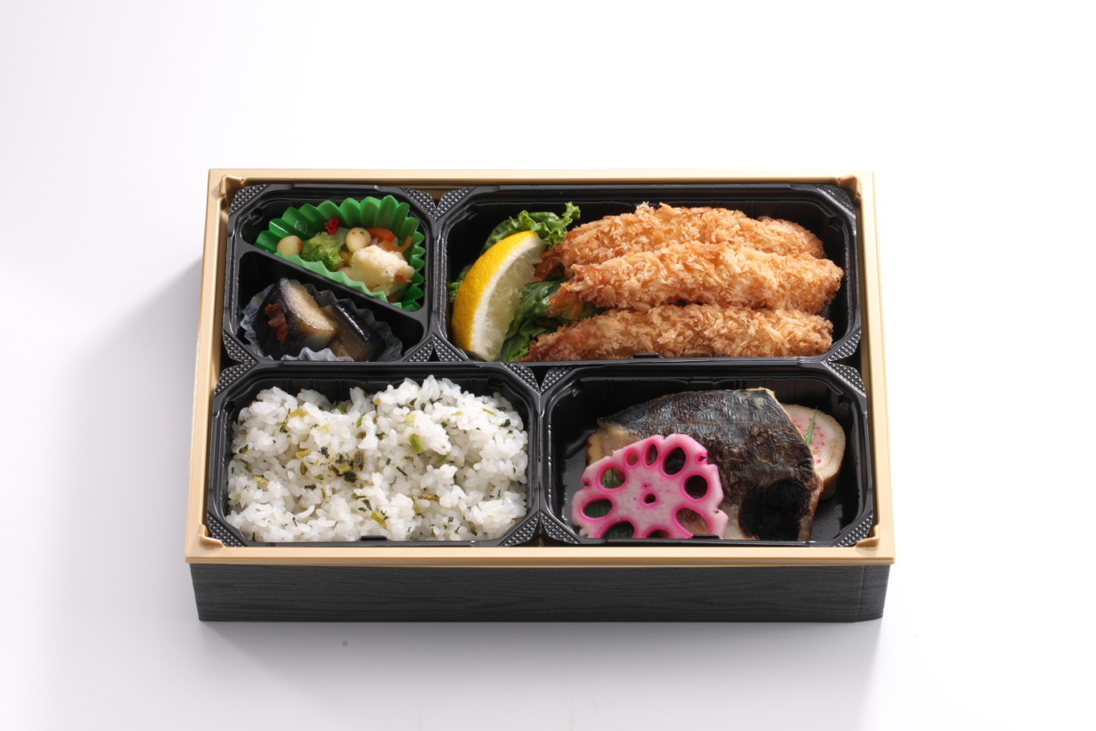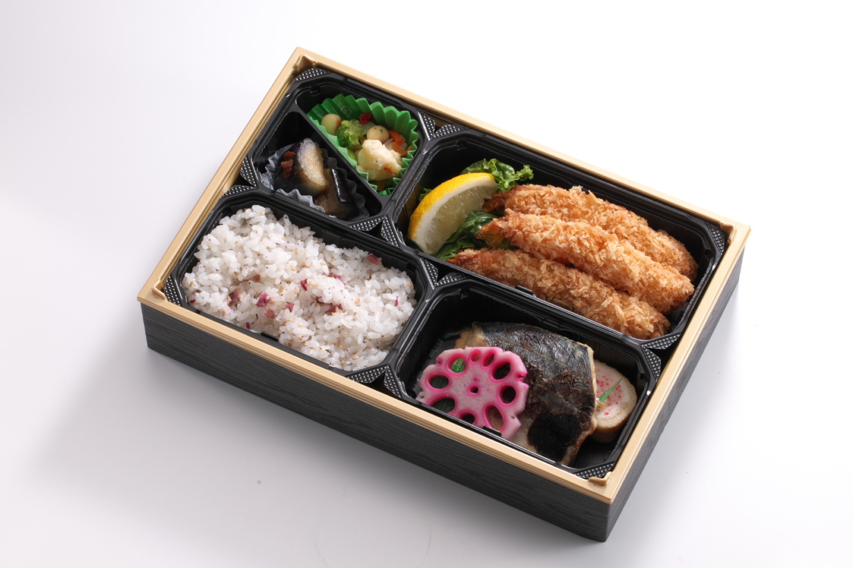 海老フライとサワラ西京焼きを組み合わせた彩り膳。会議やセミナーなど様々なシーンでご利用いただけます。ご飯が菜飯・梅しらすよりお選びいただけます。